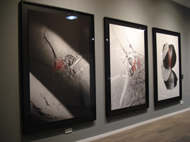. B.O.D.Y. – 月を慕ふ tsuki o shita(f)u (2013) Technik: Fotografie (S/W-Film), Mixed Media Stecknadel und roter Faden Maß: jeweils 145 x 205 cm inkl. Rahmen unicum/Unikat