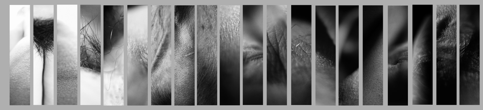 The wall installation “B.O.D.Y.” consists of a series of 20 fine art archival prints sealed with Fotosec and presented in a 20 x 100 cm space, as well as seven different sounds which can be heard through binaural haedphones and consist of recordings of people of different nationalities, gender and age groups. The 20 photos of different human bodies have been hung next to each other at 10–25 cm intervals, arranged from light to dark or dark to light gradients (there is no beginning or end of an image). In addition, seven sounds which individual guests can listen to through binaural haedphones (individual hearing in the closed system) supplement these images. Physical sensitivity is intensified together with the dual intimacy of the acoustic setting – a physically “attached” way of listening through binaural headphones where synthesised sound with an “intestinal” imagination evokes the function of internal organs (the steady rhythm of a heartbeat, breathing and the tentative sounds of organs). The intensity in both the audible range and field of view stimulate the onlookers’ imaginations, which in turn leads to a sensitisation for the otherwise invisible details of living bodies. This wall installation was created with a collage technique and the audio is based on the Surrealist method of dépaysement. The effect of the installation is intensified by the sounds, which, as a sensual audible expression, are completely devoted to the audience and allow onlookers to ultimately make their own free associations with the images.